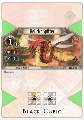The Hellfire Spitter is a cheap, simple and often underrated card. Granted, all of its stats are 1, which means it’s neither strong nor durable, but it does have 2 very useful qualities. First off, it is one of a small handful of cards to have Quickness, which means that it always attacks first, even if your opponent is attacking you. Secondly, it can attack (and therefore Counter-Attack) in all 4 directions, which also means that it has no Blind Spot. When combined, these 2 traits mean that the only way for your opponent to attack your Spitter without taking damage themselves is to use either a Magic Attack or some long ranged attack – something which should not be underestimated.