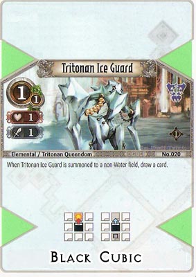 The Tritonan Ice Guard is largely unremarkable. With 1 HP, 1 Attack Power and a Summoning Cost of 1, it is neither bad nor good, it is just there. However, it does have 1 handy feature – playing it on a non-Water field lets you draw a card from your deck.