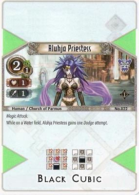 Dealing with an enemy Aluhja Priestess presents an interesting problem. The Dodge attempt makes standard attacks against it unreliable, but it is such a cheap monster that using a high-cost Magic Attack card to deal with it seems like a waste. Your options depend entirely on your play style. If you have no problem using lots of Mana on low cost creatures, feel free to use something like Undead King Novogus, or even one of the God cards to deal with it. For the more patient player, using your own Priestess or a Flame Magus to pick away at it over several turns will do the job. If you’re in a pinch, you could also boost your Flame Magus/Priestess with a Clare Wil’s Banner and finish it off in a single hit – your net Mana expenditure will be the same in the long run, and it’s certainly the most reliable method. Alternatively, if you’re the kind of person who likes a gamble, just go nuts with standard attacks. Any creature with an Attack Power of 2 or more can finish it in one hit, but you should avoid trying this in a Check situation if that Dodge attempt is the difference between victory and defeat.