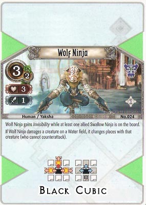 On top of that, as with other Ninjas, the Wolf Ninja gains Invisibility when another Ninja is on the board (the Wood element Swallow Ninja, in this case), making him completely invincible. Realistically, this is quite unlikely unless you make a choice to aim for this while designing your deck, but it can be a very useful ability, especially when played unexpectedly.