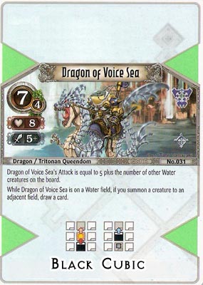 While placed on a Water Field, the Dragon of Voice Sea also gains a handy card drawing ability – every time you summon a creature next to your Dragon, you get to draw a card. This might only end up giving you 1 or 2 extra cards, but that might be enough to secure the win. Of course, you’ll need to carefully consider the current state of your deck before playing the Sea Dragon – if you are getting near the end of the game, you don’t want to risk Decking yourself accidentally. Remember, the Dragons all have plenty of HP, you won’t be losing much by summoning it to a non-Water Field, so choose carefully.