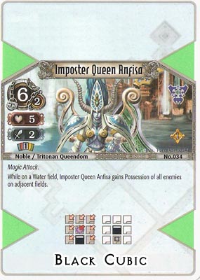 Being one of the 5 Nobles in the current set, this card is, as you would expect, quite formidable. 5HP (boosted to 7 by the Field Bonus, which this card will always have if you have any sense) means it can be tough to shift, and while 2 Attack Power might not seem like much, it is a Magic Attack, which makes it pretty useful. However, the true strength of this card is in its Possession ability. Any enemy card placed next to Anfisa will become Possessed. This means that: