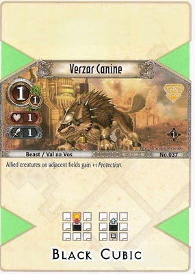 The Verzar Canine works very well with Arelai the Protector when it is placed on an Earth Field – it gains Protection itself, helping it stay alive longer to give its Protection to other cards. Another good way to use it is to place it in a corner walled in by your own cards – this makes it much harder for your opponent to destroy it, while giving Protection to the cards which are in turn protecting it.