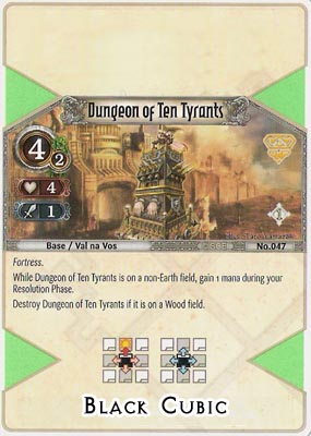 The best way to keep your own Dungeon of Ten Tyrants alive is through the use of other Fortresses. Se Hollyn’s Fortress placed next to the Dungeon for the protection bonus, or an Aegis Citadel placed on an Earth Field to give it invisibility are both great options, and you could also use a Lesser Granvenoa to prevent the Dungeon’s Field from being Fieldquaked or Exchanged to a Wood Field. Without any of those, a Healing Shower will certainly help out, but you should definitely keep in mind that any sane opponent will try and destroy this card as soon as possible, and while 4HP is nothing to frown at, it won’t last 2 turns against a determined opponent (or even 1 turn, if your luck is bad).