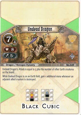 While on an Earth Field, the Undead Dragon also becomes a useful Mana Generator. Every time one of your cards next to the Dragon is destroyed, you gain 1 Mana. By placing your Dragon next to as many of your own cards as you can, you are going to start getting plenty of extra Mana back when your opponent begins destroying those cards. If you’re in a particularly strong position, you can even use sacrifice one of your own cards to gain extra Mana – summoning a 1 Cost creature next to the Dragon, on to a Field which will instantly kill that creature, you will gain 1 Mana for