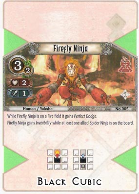The Firefly Ninja is a very trick card to analyse. On one hand, with only 2HP and 1 Attack Power, it isn’t a very strong card at all, and with a Summoning Cost of 3, it might seem a little expensive. On the other hand, it has 2 extremely potent defensive abilities that can cause your opponent some big problems – it gains Perfect Dodge when on a Fire Field (which when combined with the Field Bonus, boosts its HP to 4, giving it a measure of protection against the low cost Magic Attacks), and if you have a Spider Ninja on the board, it becomes Invisible, making it immune to all attacks.