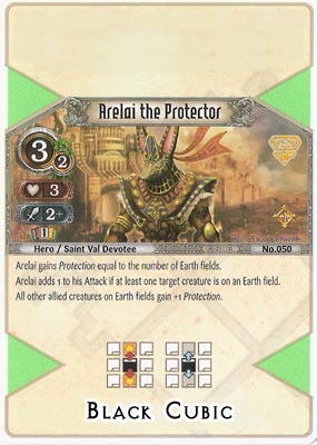 He automatically gets protection equal to the number of Earth Fields (2 in most cases) as soon as he is placed, regardless of what element his field is. Additionally, any of your other creatures on Earth Fields will get 1 Protection too. This means you have 2 options; place Arelai on an Earth Field himself, for the Field Bonus, giving him 5HP and 2 Protection and making him difficult to destroy, or placing him somewhere else and giving your other cards that protection bonus. Of course, if you don’t already have both Earth Fields occupied with your own cards, you might as well place him on an Earth Field, as any clever opponent will play take the any empty Earth Fields ASAP once you’ve played Arelai to the board.