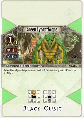 The potential of this card is obvious. A Creature which costs 1 Mana to summon, and has the chance for 6HP when summoned to a Wood Field, with an Attack Power of 2 is obviously a force to be reckoned with. On the other hand, a Creature with only 1HP and 0 Attack Power is completely useless as anything but space filler to anyone. And, unfortunately for this hapless woodsman, the Green Lycanthrope is both at the same time. Whenever it is summoned to the board, there is a 50% chance that it will be a huge, fearsome and powerful green lizard monster, and a 50% chance that it will be a tiny, basically useless woodsman.