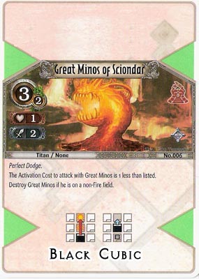 Nice review as usual, although I find it kind of silly to play up the fact that the Minos's perfect dodge ability is not dependent on field types ("Minos is 1 of only 3 cards in the game which has Perfect Dodge active all of the time – no need for specific Field types.") when the entire card is dependant on a single field type. The fact that its perfect dodge would work on a wood field doesn't do much good if the Minos dies immediately when placed on a wood field.