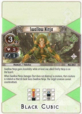 The Swallow Ninja doesn’t have any real weaknesses – it has decent HP and its abilities are not dependant on any specific field type, and while it’s Summoning Cost is a little high for its low Attack Power, its special attack more than makes up for that. This can make dealing with enemy Swallow Ninjas a little tricky – hitting them from the front will cause its counter attack to rotate all of your cards in front of it, and it’s very rare that you will be in a position to hit its Blind Spot. Basically this means that, aside from the good old reliable Fieldquake tactic, your only real recourse here is brute force. Hit it with something big and heavy before it can mess with your set up too much. Depending on the current board situation, you might be able to ignore this card, but remember that all your opponent has to do is play a Firefly Ninja on the board and not only does the Swallow Ninja become Invisible, but (assuming the Firefly is on a Fire Field) the Firefly Ninja gains Perfect Dodge too, and you find yourself with 2 very hard to shift cards boosting the enemy ranks.