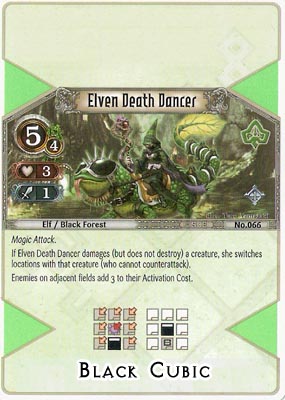 The bonuses don’t stop there however. Any enemy creature on a field next to a Death Dancer adds 3 to their Activation Cost. This is a significant penalty for your enemy, especially since using its switching power, you can put the Dancer next to any of your enemies cards currently in play. Vastly increasing your enemy’s activation costs like this will severely hamper his ability to break out of Check, and will also help keep your own cards alive for longer.